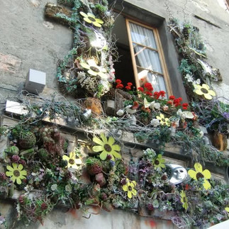 アヌシーの魅力のもう一つの要素は、町中に溢れる花々だ。運河沿いの欄干を飾るピンクのゼラニウム、紫のペチュニア。窓辺には、まるで垂直の庭園のように、様々な植物が壁一面を覆っている。黄色い花形のオーナメントが散りばめられた壁は、まるで芸術作品のようだ。